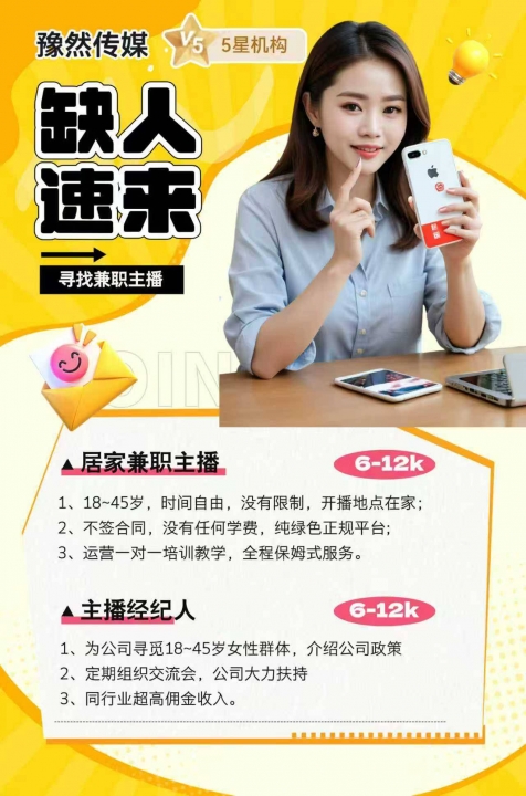 抖音直播,聊天娱乐PK,小白宝妈皆可,可兼职,可全职!居家直播,时间自由,不耽误接送孩子!18-45周岁女性,不需要有才艺,无颜值要求!一旦录用,一对一教学,教会为止,不收任何费用